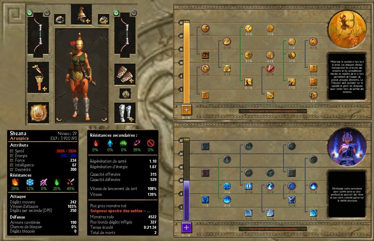 A Knossos , tous les villageois ont vu passer le Telkine . Au moins, Feiyan ne nous a pas envoyés sur une fausse piste. Hippocoon ajoute que depuis ce jour, ils n'ont pas de nouvelle de Xanthipus , leur guérisseur. Etant un peu sur les nerfs et fatigués depuis le début de notre aventure, nous jugeons qu'un guérisseur pourrait nous être utile et partons à sa recherche. Mais au moment de sortir de Knossos , le chef du nom de Diotimus nous arrête. Le gros danger qui pèse sur Knossos est lié à un squelette, un tyran qui se fait appeler Leucus et qui hante la Crête des Tritons . J'espère que Xanthippus a pu lui échapper … Nous prenons alors la route dans les Montagnes d'Héraklion , traversons le pont qui mène en Ophalion pour arriver à la Crête des Tritons . Xanthippus est coincé à l'entrée d'une grotte. Llama se porte pour l'écouter, il est coincé car sa médecine est intimement liée à son bâton magique. Et une Araignée géante le lui a volé ! Oriphéas avait beaucoup chassé dans ce coin étant jeune. Il avait entendu parler d'un ancien sorcier qui aimait prendre l'apparence d'une araignée. Il est quasi invulnérable sauf si on peut le surprendre. Pas étonnant que Xanthippus n'ait rien pu faire ! En 2 secondes, un présage m'envahit, et un mot me vient à l'esprit : K'kin'zir ! Sur la mention de ce mot, Oriphéas me confirme qu'il s'agit du nom du sorcier. Entrevoyant un plan pour le défaire nous entrons dans la grotte envahie d'Arachnos, dont une effroyable que Finolfin met au tapis. Nous apercevons au fond de la grotte une autre arachnéen, Oriphéas hurle son nom, il se retourne et nous lui tombons dessus. L'effet de surprise a marché, et nos fouilles confirment que c'est bien lui qui avait volé le bâton. Nous retournons voir Xanthippus qui nous parle de ses tarifs de guérison ; à ces prix-là, je comprends qu'il tienne à son bâton. Il est cependant tellement heureux de l'avoir récupéré (tu m'étonnes) qu'il nous requinque gratuitement et instantanément.
