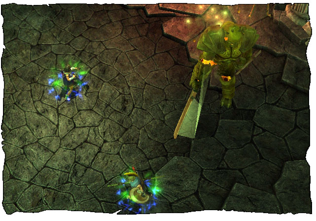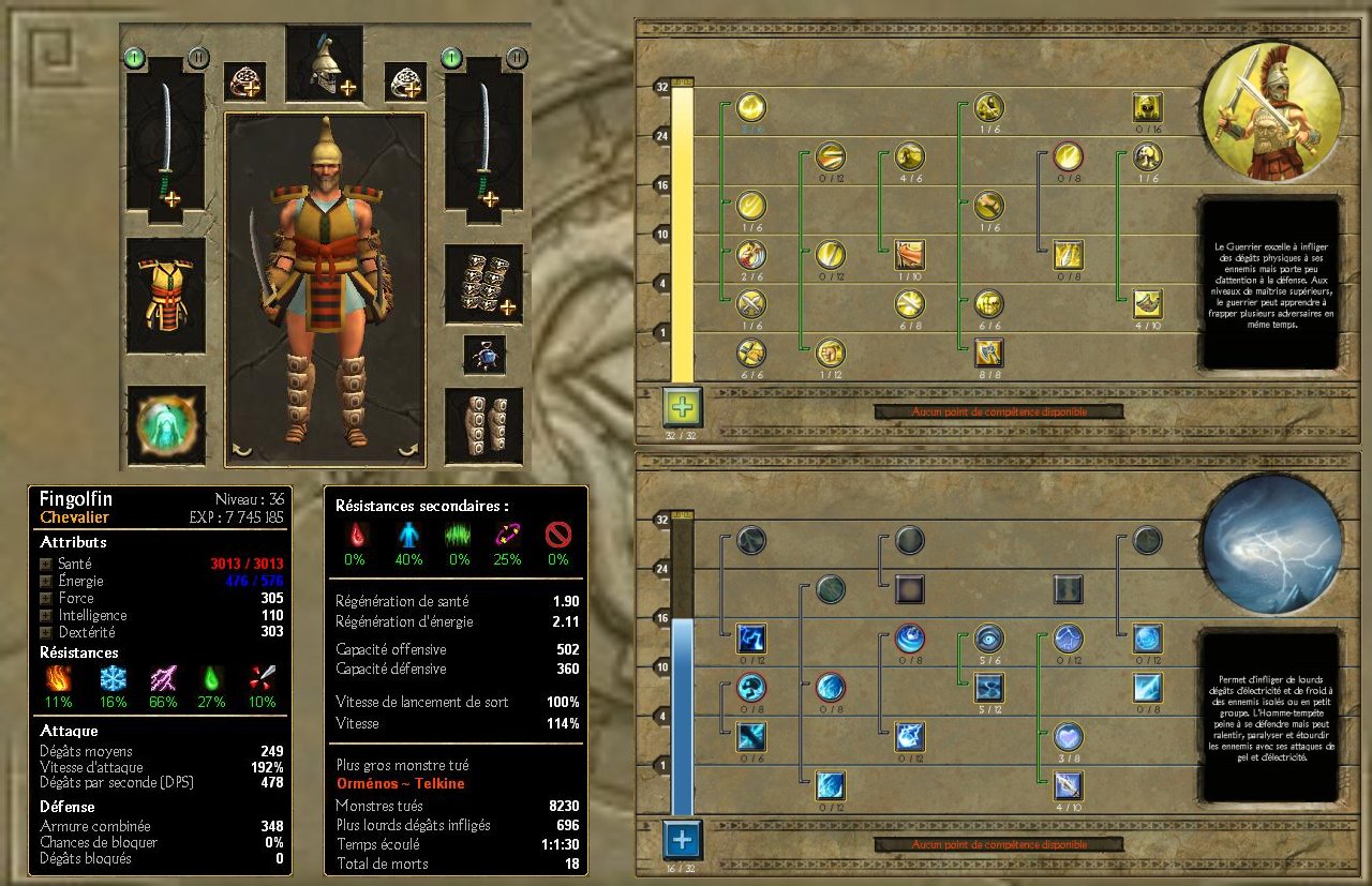 Toujours à la poursuite du Messager, nous entrons dans la Grotte des Murmures où nous tuons La Bouffie, une araignée Albinos. Dans le coffre qu’elle gardait, nous trouvons le Miroir de Psyché qu’Eurydice cherchait. Mais le Messager est plus important. Nous nous promettons de revenir voir Eurydice dès que notre course sera terminée. Nous repartons donc en direction de la Vallée du Deuil. Effectivement, nous interrompons la course de Kor-Lhrut et négocions avec lui la récupération du message. L’intérêt qu’avait Keuthonymos était de brouiller les pistes pour que personne ne remonte jusqu’à lui. Cette mission accomplie, nous remettons le pli au démon et revenons rapidement à la Haute Cité des Ames pour aider Eurydice. En fait Orphée a été emprisonné par Erato et est gardé par au moins un cyclope. Eurydice peut nous ouvrir un portail que nous nous empressons d’emprunter (ne manque plus que des empusa pour compléter ce tableau syntaxique empirique). Le portail est une sorte de Miroir des Alice donnant sur une petite grotte rocheuse. Et comme nous l’avais dit l’amoureuse, Brontès le Cyclope protège la cellule d’Orphée. Et il n’est pas seul, Stéropès aussi nous attendait. Mais ni l’un ni l’autre ne sera en mesure de nous arrêter et nous délivrons l’amoureux. Orphée se précipite vers l’extérieur et nous couvrons sa fuite pour qu’il rejoigne son Eurydice … Mmmhh dommage il était craquant le petit. Après qu’il nous ait raconté son histoire, je ne regrette rien, il aurait fini avec une flèche entre les yeux ! Nous reprenons notre route jusqu’au Campement Supérieur de Démons. Nous y croisons Akhlys, une autre héroïne Keres. Peut-être attendait-elle le messager, mais de toute façon elle ne trouvera que la Mort. Nous entrons à Erebe dont l’escalier est protégé par Thane Kavorak, un troglodyte. Juste derrière se trouve l’entrée du Nekromandio. Osso-Fléau le Dévoreur d’Ames, un démon très prétentieux, nous fournira rapidement la libération des Ombres Prêtres . Podarge ne sais comment nous remercier, elle était la suivante sur le menu du monstre. L’ambiance régnant à Erèbe ne nous sied guerre, et je ne suis pas mécontent de quitter ce lieu maudit pour les Plaines Reculées.